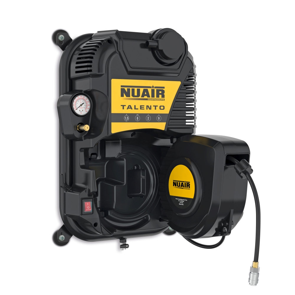 Bezolejowy kompresor ścienny NUAIR TALENTO z wężem 9 m na bębnie. Kompaktowy, cichy i bezobsługowy – idealny do warsztatów, garaży i stanowisk serwisowych.