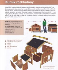 Poradnik “Budujemy kurnik krok po kroku” przedstawia dwanaście pomysłów na rozmaite niedrogie, lekkie konstrukcje kurnika, które można wykonać własnoręcznie. Każdy model został dokładnie opisany, a do tego podano zapotrzebowanie na materiały do jego wykonania. Etapy budowy zilustrowano krok po kroku dokładnymi rysunkami. Są tu też wskazówki, jak skonstruować wyposażenie kurnika: grzędy, gniazda, karmidła, rampy i drabinki.